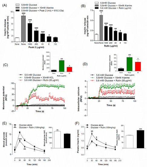 Dose-dependent effects of (A) peak 2 sample of hot water extract of A. squamosa leaves and (B) rutin on insulin release from BRIN-BD11 cells, (C) membrane potential and (D) intracellular calcium expressed as RFU and respective area under the curve, (E) glucose tolerance and (F) plasma insulin. Mice were fasted for 12 h and administered glucose (18 mmol/kg body weight) by oral gavage with or without rutin (100 mg/kg body weight). Values are Mean ± SEM for n = 8 for insulin release, n = 6 for membrane potential and intracellular calcium and n = 7 for glucose tolerance and plasma insulin. * p < 0.05, ** p < 0.01 and *** p < 0.001 compared to control.