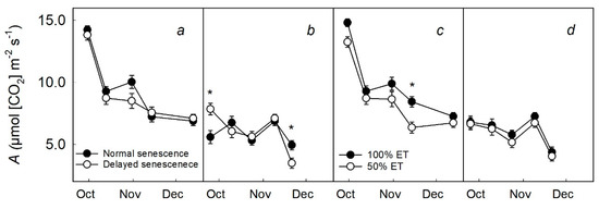 Average leaf CO2 assimilation (A) of young peach trees (n = 24) according to: (i) Senescence: trees in 2016 (a) and 2017 (b) grown under ambient fall temperatures (normal senescence, filled circles) or grown under the greenhouse environment, which resulted in a delay of senescence (delayed senescence, unfilled circles) and (ii) soil moisture: Trees in 2016 (c) and 2017 (d) that were well-watered (100% ET, filled circles) or water-deficient trees (50% ET, unfilled circles). Error bars represent ±standard error of the mean while asterisks show statistical differences (p ≤ 0.05) between the two treatments.