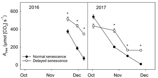 Estimation of whole tree assimilation (Atree) of normal senescence trees (filled circles) and delayed senescence trees (unfilled circles) during the fall of 2016 (n = 16) and 2017 (n = 12). The Atree estimate is calculated from an averaged assimilation value, leaf area, and leaf number per tree. Error bars represent ±standard error of the mean while asterisks show statistical differences (p ≤ 0.05) between the two treatments.