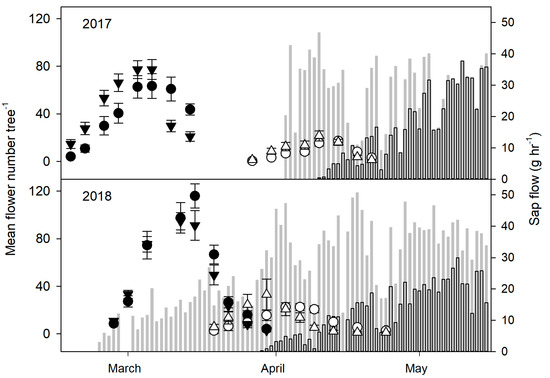The total number of open blooms with petals still attached were counted from 16 trees every four days during the spring of 2017 and from 8 trees in 2018. Sap flow was measured every 30 min using sap flow sensors (Model SGEX25 and Flow32-1K monitoring system, Dynamax, Houston, TX, USA) attached to six NS and six DS trees during spring (3 April through 1 June 2017, and 20 February through 30 May 2018). In 2018, one NS tree died and was excluded.