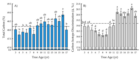 The tree age main effect was significant for total carbon (p = 0.0023) and carbon isotope discrimination (p < 0.0001) (Table 1). The total carbon ranged from 47.72 ± 0.17% (four years) to 48.86 ± 0.21% (16 years), with an overall mean of 48.20 ± 0.05% (Figure 1A). In general, the total carbon increased over time until 16 years after planting, then significantly decreased 2% during the last year of the study. Carbon content of 16-year-old trees was also 2% greater than that of 4-, 5-, 6-, and 8-year-old trees. Carbon isotope discrimination (Δ) ranged from 18.10 ± 0.20‰ (eight years) to 20.60 ± 0.16‰ (16 years), with an overall mean of 19.20 ± 0.08‰ (Figure 1B). From years six to nine, Δ decreased 2 to 4% as compared with three-year-old trees, with Δ during those four years being 4 to 6% significantly less than the overall mean. At years 10 and 11, Δ increased until reaching its maximum at 16 years, which was not different than at 12, 13, 14, 15, or 17 years. Values for Δ during the last six years of the study were 3 to 7% greater than the overall mean (Figure 1B).