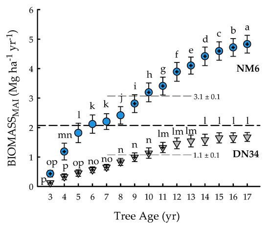 The clone × age interaction was significant for BIOMASSMAI (p < 0.0001) (Table 1). BIOMASSMAI ranged from 0.1 ± 0.1 (‘DN34′, three years) to 4.8 ± 0.3 (‘NM6′, 17 years) Mg ha−1 yr−1, with an overall mean of 2.1 ± 0.1 Mg ha−1 yr−1 (Figure 2). The annual biomass production of ‘DN34′ stabilized during years 14 to 17, while that of ‘NM6′ continued to increase until harvest at age 17 years. Overall, ‘NM6′ exhibited 182% greater BIOMASSMAI, averaged across the rotation. BIOMASSMAI of ‘DN34′ never reached the overall mean, and annual productivity for ‘DN34′ from years three to 11 was 36 to 94% significantly less than the overall mean. In contrast, BIOMASSMAI of ‘NM6′ was 36 to 133% significantly greater than the overall mean from years 9 to 17 (Figure 2).