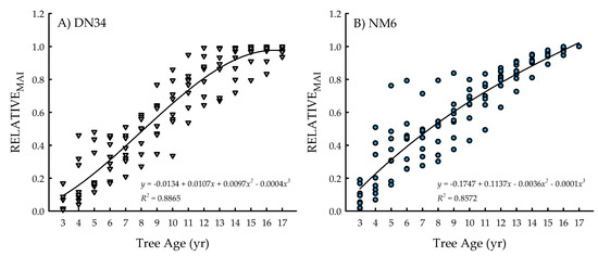 The clone × age interaction was significant for RELATIVEMAI (p = 0.0305) (Table 1), with cubic equations exhibiting the best model fit for both clones (Figure 3A,B). Specifically, the coefficients of determination were R2 = 0.8865 for ‘DN34′ and R2 = 0.8572 for ‘NM6′. The growth curves for both clones represented three distinct developmental plantation stages. In particular, there was an early peak in growth rates through the first 4 years (i.e., relatively substantial increases in RELATIVEMAI). From five to 13 years, there was a steady increase in RELATIVEMAI, followed by a leveling off of RELATIVEMAI (i.e., changes in growth rates < 5% annually) from years 14 to 17 (Figure 3A,B).
