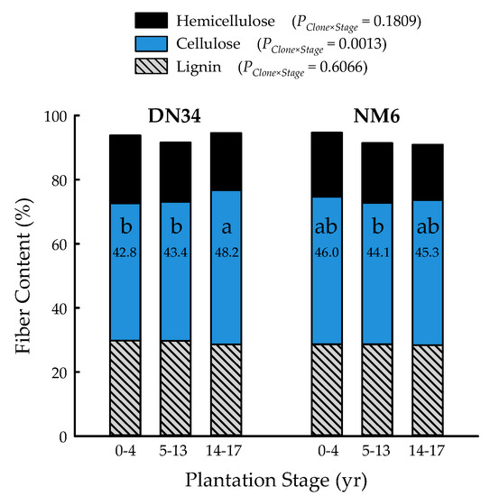 The clone and plantation stage main effects were significant for lignin (p = 0.0468) and hemicellulose (p < 0.0001) fiber content, respectively, while the clone × plantation stage interaction governed cellulose content (p = 0.0013) (Table 1). Lignin was 3% greater for ‘DN34′ (29.4 ± 0.3%) than ‘NM6′ (28.6 ± 0.2%), across plantation stages. Hemicellulose content significantly decreased with tree age, with 20.6 ± 0.3%, 18.6 ± 0.2%, and 17.5 ± 0.3% for 0- to 4-, 5-, to 13-, and 14- to 17-year-old trees, respectively. Plantation stages 0 to 4 years and 14 to 17 years were significantly different than the overall mean of 18.9 ± 0.2% hemicellulose. Cellulose content ranged from 42.8 ± 0.7% (‘DN34′, 0 to 4 years) to 48.2 ± 0.9% (‘DN34′, 14 to 17 years), with an overall mean of 45.0 ± 0.4% (Figure 4). Trees of ‘DN34′ had the highest cellulose content during plantation stage 14 to 17 years, which was 12% and 11% greater than 0 to 4 and 5 to 13 years, respectively, which were not different from one another. For ‘NM6′, the cellulose content did not differ among plantation stages (Figure 4).