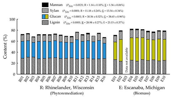 Percent mannan, xylan, glucan, and lignin across two hybrid poplar clones [Populus deltoides Bart. ex Marsh. × P. nigra L. ‘DN34′; P. nigra × P. maximowiczii A. Henry ‘NM6′] grown for phytoremediation at the former Rhinelander City Landfill in Rhinelander, WI, USA, and biomass production at the Michigan State University, Forest Biomass Innovation Center (FBIC) in Escanaba, MI, USA. Probability values for site main effects are listed in parentheses, along with means ± one standard error. R01 to R16 = trees 1 to 16 in Rhinelander; E01 to E10 = trees 1 to 10 in Escanaba.