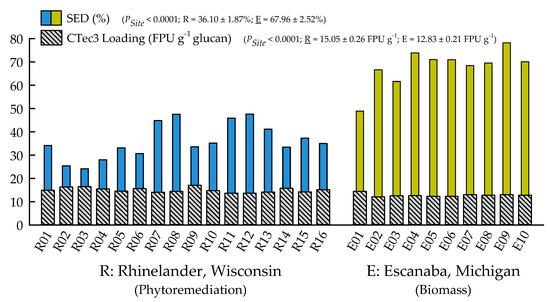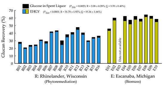 Biofuels recalcitrance results of the current study are in agreement with previous studies [41,72]. Work has been conducted for testing biofuels yields from ‘NE222′ grown for biomass production while using SPORL pretreatment [39] and acid hydrotropic fractionation [40,73] to evaluate substrate enzymatic digestibility (SED), sugar yield, production of furfural, and other related traits. The lower lignin content in the Escanaba biomass trees may have resulted from differences in the presence of tension wood, given that tension wood contains higher glucan content and undergoes higher enzymatic conversion to fermentable sugars [74]. In the current study, under the same pretreatment conditions, Escanaba trees had much better SED (i.e., were less recalcitrant) than Rhinelander trees (Figure 6), indicating some site-related factors in their biofuel potential (see above).