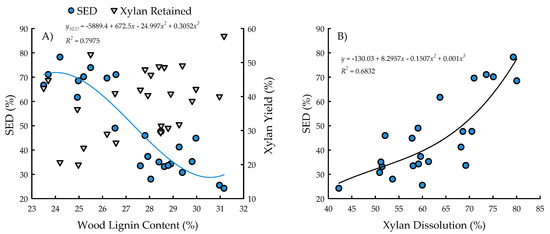Substrate enzymatic digestibility (SED; %) and xylan yield (%) versus wood lignin content (%) (A) and SED versus xylan dissolution (%) (B) across two hybrid poplar clones [Populus deltoides Bart. ex Marsh. × P. nigra L. ‘DN34′; P. nigra × P. maximowiczii A. Henry ‘NM6′] grown for phytoremediation at the former Rhinelander City Landfill in Rhinelander, WI, USA. The relationship between xylan yield and lignin was not significant at p < 0.05.