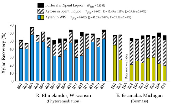 Percent recovery of furfural in spent liquor, xylose in spent liquor, and xylan in water insoluble solids (WIS) across two hybrid poplar clones [Populus deltoides Bart. ex Marsh. × P. nigra L. ‘DN34′; P. nigra × P. maximowiczii A. Henry ‘NM6′] grown for phytoremediation at the former Rhinelander City Landfill in Rhinelander, WI, USA, and biomass production at the Michigan State University, Forest Biomass Innovation Center (FBIC) in Escanaba, MI, USA. The probability values for site main effects are listed in parentheses, along with means ± one standard error. R01 to R16 = trees 1 to 16 in Rhinelander; E01 to E10 = trees 1 to 10 in Escanaba.