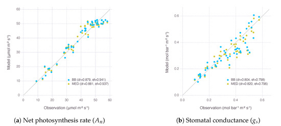 Evaluation of the gas-exchange model with two stomatal conductance submodels, Ball–Berry (BB) and Medlyn (MED), after calibrating parameters related to nitrogen (, s) and stomata (, ). Each dot represents an observed photosynthesis rate () or stomatal conductance () under a given experimental condition and a corresponding estimation by the model. A gray solid line shows 1:1 reference for comparison. dr indicates Willmott’s refined index of agreement (), and ef indicates Nash–Sutcliffe modeling efficiency coefficient (NSE).