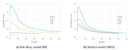 We did not find much difference in performance between two stomatal conductance submodels BB and MED when used for fitting calibration dataset (Figure 1). It is known that two models have equal predictive strength for non-extreme environmental conditions where the data are usually collected for calibration and validation [25]. Results started deviating from each other under more extreme conditions, such as low and low , which are also close to the range where gas-exchange instruments often find difficulties in accurate measurements (Figure 2, Figure 3, Figure 4 and Figure 5b,f). Under low , especially below 50%, had much higher rate of decrease and almost converged to in the end, whereas maintained higher than with smooth and gentle transitions most of the time (Figure 2). Seemingly degenerate behavior of might be an overlooked effect of as a parameter estimated from regression rather than a directly measured value [26]. A clearly different response from each model warrants caution, especially when applying models to extreme conditions, such as concurrent exposure to high temperature and high vapor pressure deficit (VPD), likely encountered in future climate projections [27].