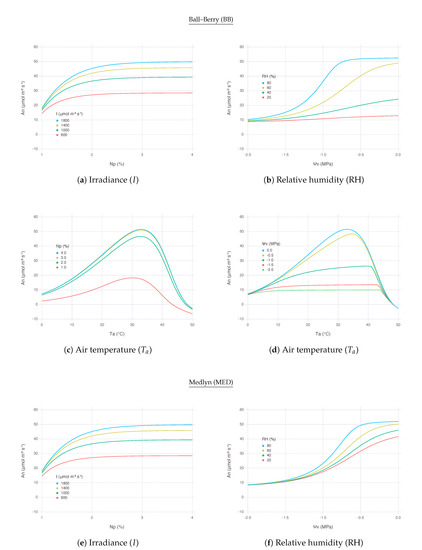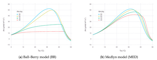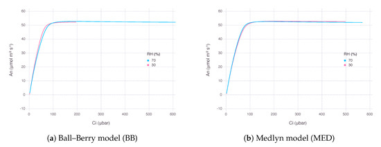 We compared two variants of the gas-exchange model depending on which submodel was used for calculating stomatal conductance: Ball–Berry (BB) and Medlyn (MED). Net photosynthetic rate () was calculated over a range of values for specific environmental input variables, atmospheric and air temperature (). ranged from 0 μbar to 1500 μbar ranged from −10 to 50 . Other environmental variables remained constant as default values (Table 1). Since stomatal conductance can be more directly related to the relative humidity of surrounding air () than other variables, a response curve of was separately obtained for ten levels of from 0% to 100%.