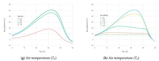 We simulated nitrogen and water stress factors by adjusting relevant parameter values. For nitrogen stress, leaf nitrogen content (N) was changed from 0 g m−2 to 2 g m−2 to impose stress when N was lower. For water stress, bulk leaf water potential () was changed from 0 MPa down to −3 MPa to impose stress when was lower. The range of values were deliberately chosen by first selecting biophysically feasible extremes, 0 g m−2 for N and 0 MPa for , then selecting a value for the other end where output variable exhibits a clear convergence. When simulating a response for each stress factor, the other stress factor assumed to be not limiting. The response curve of net photosynthetic rate () was obtained for multiple environmental input variables including relative humidity (), atmospheric (), air temperature (), and irradiance (I).