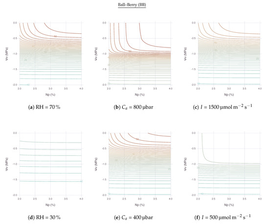 At high , remained relatively stable within its optimal range when both N and kept high for less stress (Figure 6a,g). An area of this region located in the upper right side of contour plot shrunk and so did the range of non-limiting N and as went down. In other words, with lower , became more sensitive to both nitrogen and water stress factors. The reduction of for lower was extremely strong with BB (Figure 6d) compared to MED (Figure 6j). No other variables showed such drastic difference between BB and MED in the comparison.