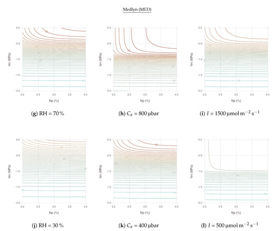 Responses of net photosynthesis rate () under nitrogen and water stress implied by relative leaf nitrogen content () and bulk leaf water potential () for the two variants of coupled gas-exchange model using Ball–Berry (BB) and Medlyn (MED). (a,d,g,j) Contrasting effects of high and low relative humidity. (b,e,h,k) Comparison between elevated and current concentrations of atmospheric (). (c,f,i,l) Comparison between high and low levels of irradiance (I). Contour lines are spaced at an interval of 1 μmol m−2s−1 of the simulated values.