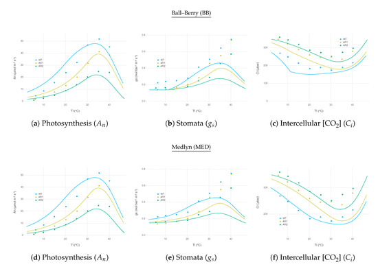 A few parameters were derived to replicate a wide range of temperature response of transgenic plants with reduced amounts of Rubisco reported by Kubien et al. [39]. We mostly used the same values for variables and parameters identified in the paper, except , which was not mentioned but needed adjustments to replicate original curves (Table A3). Measured values of , , and under three treatments were digitized from their Figure 1. WT indicates wild type, while AR1 and AR2 refers to mutants treated with anti-Rubisco antibody to have Rubisco content reduced to 49% and 32%, respectively.