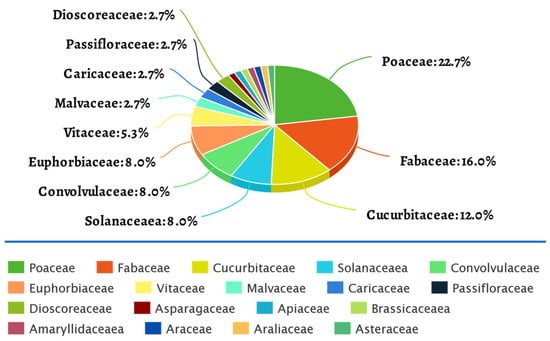Twenty-nine host plants, including crops, medicinal and ornamental plants (Table 2) have been used in HTS for virus detection or diagnostic in Africa since 2010. These host plants belong to 18 different families of which five—Poaceae, Fabaceae, Cucurbitaceae, Solanaceae, Convolvulaceae and Euphorbiaceae—took the biggest share (Figure 2), mainly because they contain many economically important crops. While some studies focused on a host plant in a specific country or environment as in the case of papaya [,], groundnut [,], tannia [], cabbage [], cotton [], grapevine [,,,] to mention a few; in other studies, the viromics of a host plant was analyzed across different countries in a same survey. The information generated in such analyses has provided a better understanding of the status and distribution of the viruses identified for a specific host plant. Selected case studies will be the focus of the next paragraphs.