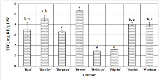 Variability in the total amount of flavonoids (TFC) in fruit samples of different American cranberry cultivars; different letters indicate statistically significant (p < 0.05) differences between the studied cranberry fruit samples.