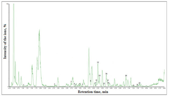 UPLC-ESI-MS/MS chromatogram of the ethanol extract of American cranberry (cultivar ‘Bergman’) fruit sample. The identified and quantitatively evaluated analytes are marked by numbers: 1—gallic acid, 2—neochlorogenic acid, 3—chlorogenic acid, 4—vanillic acid, 5—caffeic acid, 6—(–)-epicatechin, 7—procyanidin C1, 8—p-coumaric acid, 9—rutin, 10—luteolin-7-rutinoside, 11—ferulic acid, 12—hyperoside, 13—luteolin-7-O-glucoside, 14—procyanidin A2, 15—avicularin, 16—quercitrin, 17—isorhamnetin-3-O-glucoside, 18—phloridzin, 19—quercetin, 20—phloretin, 21—kaempferol, 22—isorhamnetin.