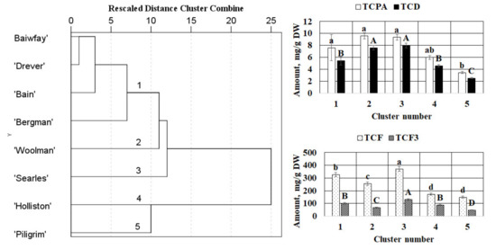 The dendrogram of hierarchical cluster analysis (HCA) of cranberry fruit based on the phytochemical composition and mean values of total contents of the identified compounds (mg/g DW) of clusters extracted using HCA. TCD—total content of dihydrochalcones; TCPA—total content of phenolic acids; TCF—total content of flavonols; TCF3—total content of flavan-3-ols. The different letters indicate significant differences between the values.