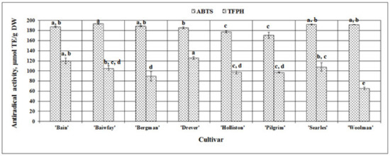 Variability in the antiradical activity in vitro in fruit sample extracts of different American cranberry cultivars; different letters indicate statistically significant (p < 0.05) differences between the studied cranberry fruit samples.