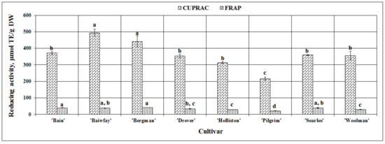 Variability in the reducing activity in vitro in fruit sample extracts of different American cranberry cultivars; different letters indicate statistically significant (p < 0.05) differences between the studied cranberry fruit samples.