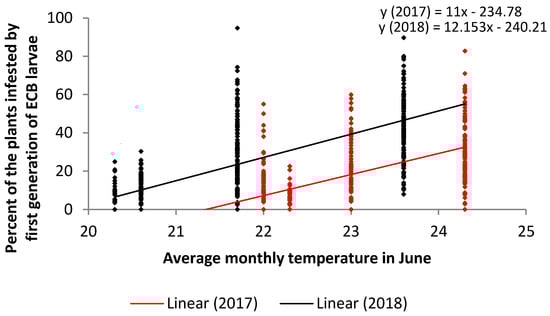 Regression analysis of the average monthly temperature in June (x) versus the percent of infestation with first generation of ECB larvae (y) in two years (2017—red and 2018—black).