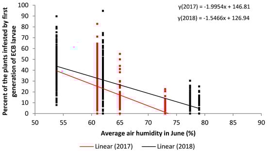 Regression analysis of the average air humidity in June (x) versus the percent of infestation with first generation of ECB larvae (y) in two years (2017—red and 2018—black).