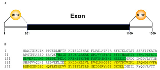 Gene structure was analyzed using expasy (A) Schematic structure of the genomic DNA showing exon (black block) and untranslated region (UTR) (grey lines) of GhTRX134. (B) The protein sequence with the two thioredoxins (TRX) domains (PF00085), 76-166 aa and 200-285 aa, are green and yellow highlighted, respectively.