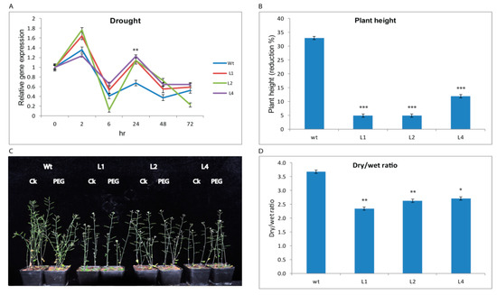 Overexpression of GhTRX134 in Arabidopsis enhanced drought tolerance. Two-week-old plants were treated with 20% polyethylene glycol (PEG). (A) The expression of GhTRX134 in transgenic lines and wild-type (Wt) under drought treatment was monitored by qRT-PCR. (B) Plant height was measured in centimeters (cm), and the percent reduction was calculated in transgenic lines and Wt plants under drought and control (CK) conditions. (C) Phenotypes of untreated (CK) transgenic and Wt plants compared with plants after drought treatment. (D) Differences in dry/wet ratios between transgenic plants and Wt plants after PEG6000 treatment; dry/wet ratio calculated by dry weight/wet weight of plants. The data represent the means of three replicates ±SDs. Asterisks indicate significance (* p < 0.05; ** p < 0.01; and *** p < 0.001) compared to Wt as determined by Student’s t-test.