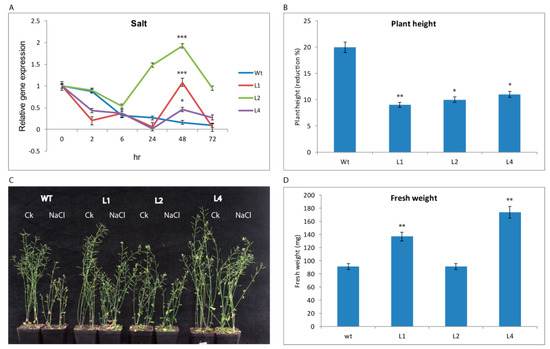 For salt, GhTRX134 was expressed more in the transgenic lines than the Wt plants at 48 h post-salt treatment (Figure 3A). Phenotypic analysis revealed that transgenic plants displayed a lower plant height reduction than the Wt plants, which exhibited a severe reduction in plant height under salt stress (Figure 3B,C). Additionally, transgenic plants had a higher fresh weight than the Wt plants (Figure 3D), suggesting that the overexpression of GhTRX134 confers salt tolerance to Arabidopsis.