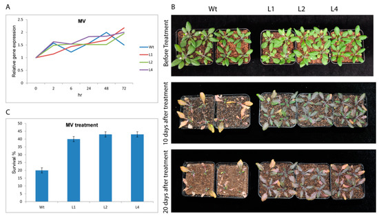T3 transgenic Arabidopsis plants and wild-type (Wt) seeds were grown on an Arabidopsis growth chamber for phenotypic comparisons and gene expression analysis. Various treatments (20% polyethylene glycol (PEG), 200 mM NaCl, cold, and 20 μM methyl viologen oxidative) were applied on two-week-old transgenic seedlings and Wt. Cold treatment was conducted in the dark by transferring the plants from normal conditions 22 °C to 4 °C for 72 h, whereas control plants were placed in the dark at 22 °C for 72 h. Samples: third–fourth rosette leaves were collected from both stress-treated and control plants after 0, 2, 6, 24, 48, and 72 h of drought, salt, oxidative, and cold stress treatments. Samples were frozen in liquid nitrogen, stored at −80 °C, and used for extraction of total RNA.