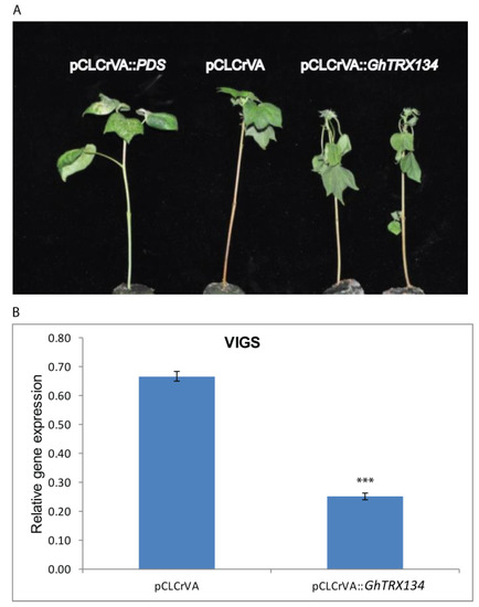 Specific primers containing the restriction sites Spe1 and Asc1 were used to amplify a443base pair (bp) fragment of GhTRX134 via PCR and cloned into the pMD 18-T vector as described by the manufacturer (TaKaRa, China virus [25]). pMD 18-T was digested with the same restriction enzymes and then inserted into the pCLCrVA vector with the Spe1 and Asc1 restriction sites, as well as pCLCrVB, as a helper vector, and its derivatives pCLCrVA::GhTRX134, pCLCrVA::PDS, and pCLCrVA (control). All derivative plasmids were individually transferred into cotton cotyledons through Agrobacterium as described by Gu [26]. Phenotypes and gene expression were analyzed one month later. All steps were performed as described previously by Gao [25].
