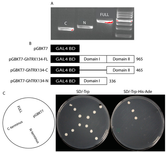 To examine the transcriptional activity of GhTRX134, the pGBKT7 empty vector and the constructs of the GhTRX134 gene were transformed into the yeast strain AH109. All transformants were grown on SD/-Trp. Yeast cells containing the pGBKT7 empty vector, pGBKT7-GhTRX134N, and pGBKT7-GhTRX134C did not grow on the selective medium (SD/-Trp-Ade-His). However, cells containing pGBKT7-GhTRX134FL grew on SD/-Trp-His-Ade (Figure 6), indicating that full-length GhTRX134 functions as a transcriptional activator