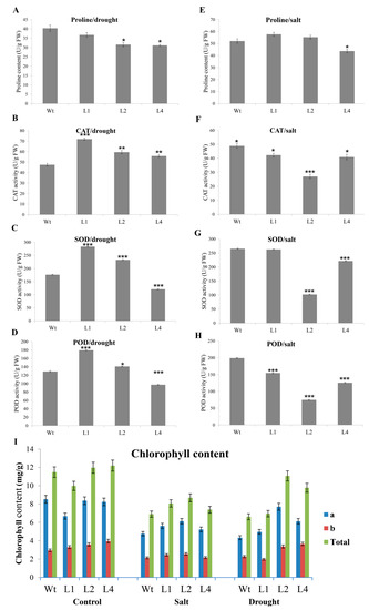 The fresh leaves of Wt and transgenic plants were harvested 5 days after drought and salt treatments. Proline content was detected using the sulfosalicylic acid method [27]. The enzymatic activities of CAT, SOD, and peroxidase (POD) were measured at 240 nm, 560 nm, and 470 nm, respectively, using a spectrophotometer according to [28]. Chlorophyll content was analyzed using 80% acetone, and the pigments a, b, and total chlorophyll were measured at 663 nm, 645 nm, and 652 nm, respectively, using a spectrophotometer as described by Lichtenthaler [29].