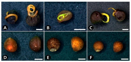 Twenty seeds per species (a total of 140 seeds) were measured and subjected to optical observation. Seed length, width, and the length/width ratio were measured using a digital vernier caliper (CD-15CP, Mitutoyo, Kawasaki, Japan). Shape, cross-sectional shape, color, hilum hair, and embryo exudation were observed using a stereomicroscope and images captured using a digital camera (Olympus DP21, Olympus, Tokyo, Japan). To observe embryo exudation, seeds were placed into boiling water for 10 min. Seed color was determined according to the Royal Horticultural Society Mini-color Chart [70].