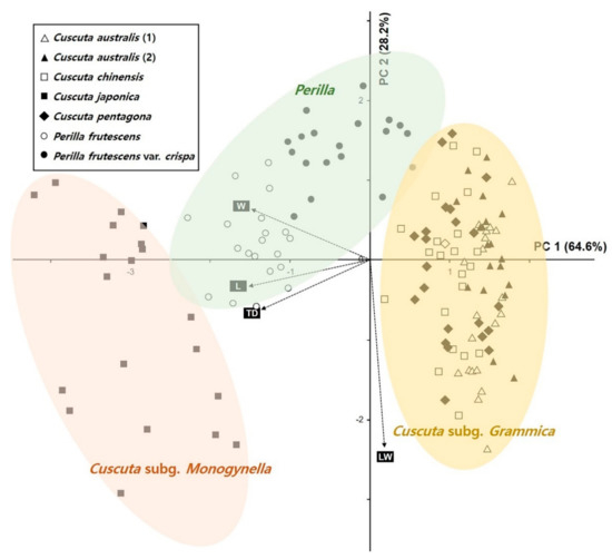 To verify whether four quantitative variables (seed length, seed width, L/W, and epidermal cell diameter) grouped the species, principal component analysis (PCA) was performed using PC-ORD version 5.31 [71].