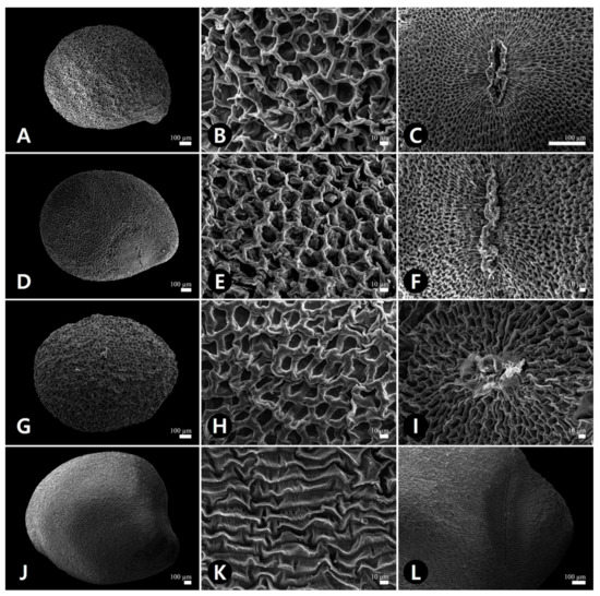 - Barthlott, W. Microstructural features of seed surface. In Current Concepts in Plant Taxonomy; Heywood, V.H., Moore, D.C., Eds.; Academic Press: London, UK, 1984; pp. 95–105. [Google Scholar]