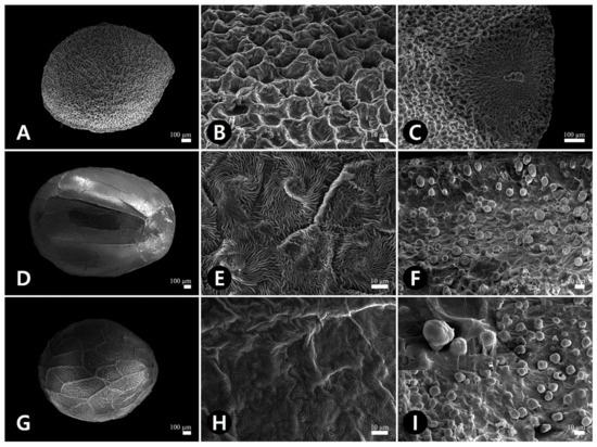 Scanning electron micrographs showing the seed (A,D,G), detailed testa ornamentation (B,E,H), and the hilum (C,F,I). (A–C) Cuscuta pentagona. (D–F) Perilla frutescens var. frutescens. (G–I) P. frutescens var. crispa. (I) Detailed glandular trichomes.