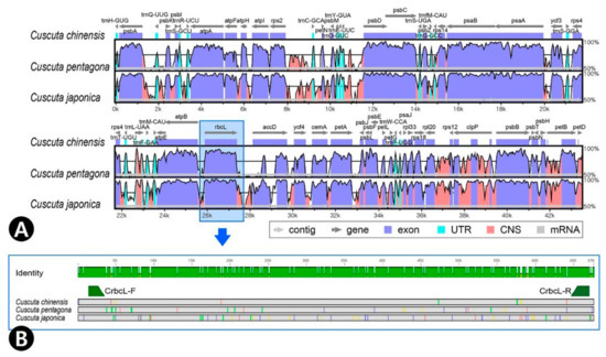 Schematic diagram of Cuscuta chloroplast genomes and novel DNA barcode primer design using rbcL. (A) Comparative analysis of the chloroplast genomes of three Cuscuta species using mVISTA, with the C. japonica chloroplast genome as the reference. Blue block, conserved genes; sky-blue blocks, tRNA and rRNA genes; red blocks, conserved non-coding sequences (CNSs); white blocks, polymorphic regions among the three Cuscuta species. A 50% identity cut-off was used for the plots. The Y-axis represents 50–100% identity. (B) Green arrows indicate novel DNA barcode primers. Colored regions indicate variable sequences in the three Cuscuta species.
