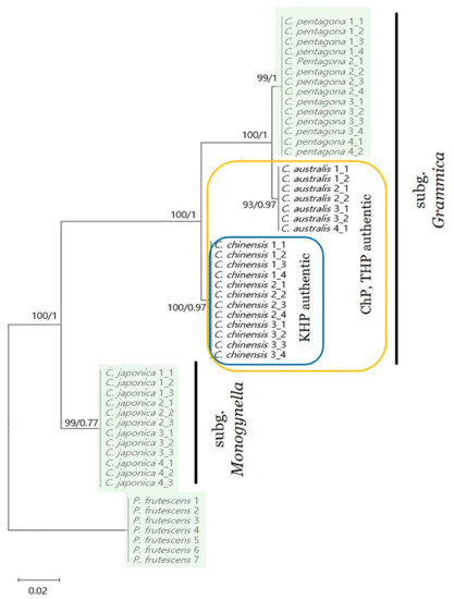 Phylogenetic analysis of five species using the maximum likelihood (ML) and Bayesian inference (BI) methods with Cuscuta rbcL sequences and Perilla frutescens rbcL sequences downloaded from Genbank as outgroups (1: FJ513160; 2: KP644065; 3: KT220688; 4: KX397889; 5: MG223657; 6: MG224544; 7: KY624981). ML topology is shown with bootstrap (BS) values (%) and BI posterior probability (PP) values at each node. ChP, Pharmacopoeia of the China; KHP, Korean Herbal Pharmacopoeia; THP, Taiwan Herbal Pharmacopeia. Green shaded species indicate adulterants of CS.