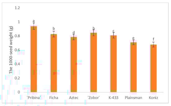 Moreover, we observed an effect of the growing season on this tested yield parameter (Table 1). The latter effect can be caused due to climate conditions during vegetation. From our previous results, it is evident that the effect of locality on seed weight was not present but a genotype × year interaction was found [38]. Hovewer, new varieties “Pribina” and “Zobor” demonstrated sTable 1000-seed weight performance over several cropping seasons (Figure 1).