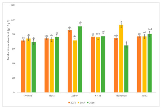 Total amino acid content (g/16 g N) in amaranth seed samples for three cropping seasons (2016–2018). Results are the means (± SE; standard error) for three seasons of three independent biological replicates per each variety per year. Different letters on bars indicate significant differences by the Tukey test (p ≤ 0.05).