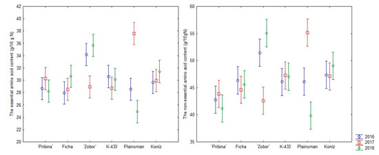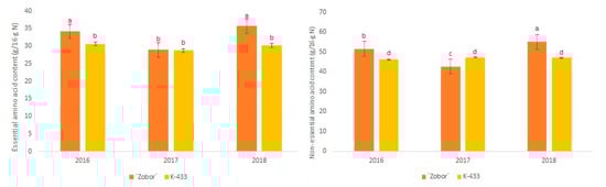 Mutant variety “Zobor” showed a significantly higher (p ≤ 0.05) content of essential isoleucine (2.09 ± 0.04 g/16 g N) and valine (2.30 ± 0.05 g/16 g N), and nonessential tyrosine (2.75 ± 0.30 g/16 g N) ompared to nonirradiated control K-433 (1.43 ± 0.16 g/16 g N; 1.63 ± 0.14 g/16 g N; 2.11 ± 0.27 g/16 g N, respectively) during the monitored period (Table 2). Moreover, statistical analysis confirmed significantly higher (p ≤ 0.05) content of both EAA and NEAA in mutant variety “Zobor” over the hybrid K-433 in 2016 and 2018 (Figure 3).