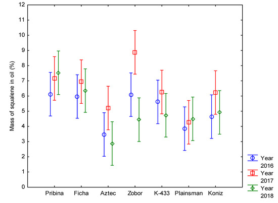 Mutant variety “Pribina” showed the highest SQ value (6.94 ± 0.70%), while the lowest content was detected in variety Aztec (3.85 ± 1.20%; Table 3). Different extraction methods are used to define the SQ content in particular natural extracts. In our study, the SQ content was determined in the oil. Subsequently, by measuring the oil content of the seeds, the SQ amount in the seed was calculated (Table 3).