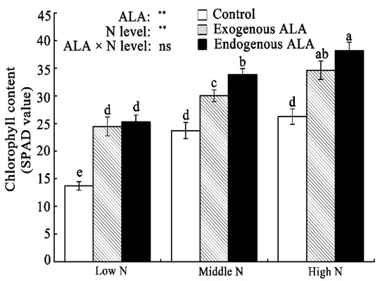 Figure 1. Differences in chlorophyll content (represented as SPAD values) in exogenously 5-aminolevulinic acid (ALA)-treated and endogenous ALA-overproducing canola leaves grown under low-, middle-, and high-N conditions. Means ± standard errors are presented (n = 10). Means with the same letter indicate a nonsignificant difference (p > 0.05), according to Duncan’s test. Sources of variation: ALA, N-level, and ALA × N-level interaction; ** p < 0.01; ns: not significant. N = nitrogen.