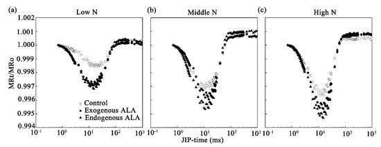 Figure 5. Changes in 820-nm modulated reflection (MR) curves, expressed as normalized MR (represented as MRt/MRo), in exogenously-treated or endogenous ALA-overproducing canola leaves grown under (a) low-, (b) middle-, and (c) high-N conditions.