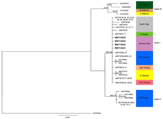 - Kumar, S.; Stecher, G.; Tamura, K. MEGA7: Molecular Evolutionary Genetics Analysis version 7.0. Mol. Biol. Evol. 2016, 33, 1870–1874. [Google Scholar] [CrossRef] [PubMed]
