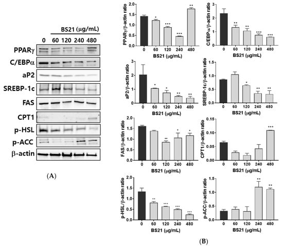We next confirmed the expression of white adipocyte marker proteins in 3T3-L1 cells. BS21 treatment for 7 days significantly reduced the protein expression of white adipocyte markers (peroxisome proliferator-activated receptor γ (PPARγ), CCAAT/enhancer-binding protein (C/EBPα), and adipocyte protein 2 (ap2)) and lipogenic markers (sterol regulatory element-binding protein (SREBP1c) and fatty-acid synthase (FAS)) in a dose-dependent manner (Figure 2A,B). Expression levels of the β-oxidation proteins (CPT1 and p-ACC) were significantly increased by 400 μg/mL BS21. The phosphorylation of the lipolysis gene HSL decreased with BS2. These results suggest that BS21 can regulate lipid metabolism in 3T3-L1 adipocytes.