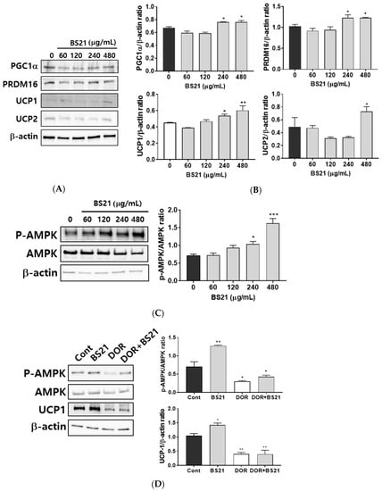 We next investigated whether BS21 affects lipid metabolism and browning via AMPK. BS21 at concentrations of 240 and 480 μg/mL increased AMPK phosphorylation (Figure 3C). This finding suggested that the increased lipid metabolism and browning effect in BS21-treated 3T3-L1 adipocytes could be mediated by AMPK activation. To further examine the AMPK signaling mechanism of the browning effects of BS21, we treated an AMPK antagonist (dorsomorphin). Elevated UCP1 expression was diminished by treatment with dorsomorphin (Figure 3D). These results indicate that BS21 induced the browning of 3T3-L1 adipocytes by enhancing AMPK phosphorylation.
