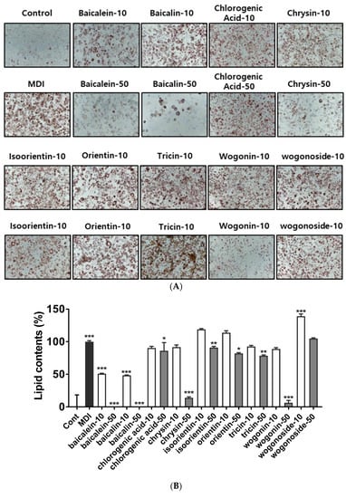 - Kwak, D.H.; Lee, J.H.; Song, K.H.; Ma, J.Y. Inhibitory effects of baicalin in the early stage of 3T3-L1 preadipocytes differentiation by down-regulation of PDK1/Akt phosphorylation. Mol. Cell Biochem. 2014, 385, 257–264. [Google Scholar] [CrossRef]